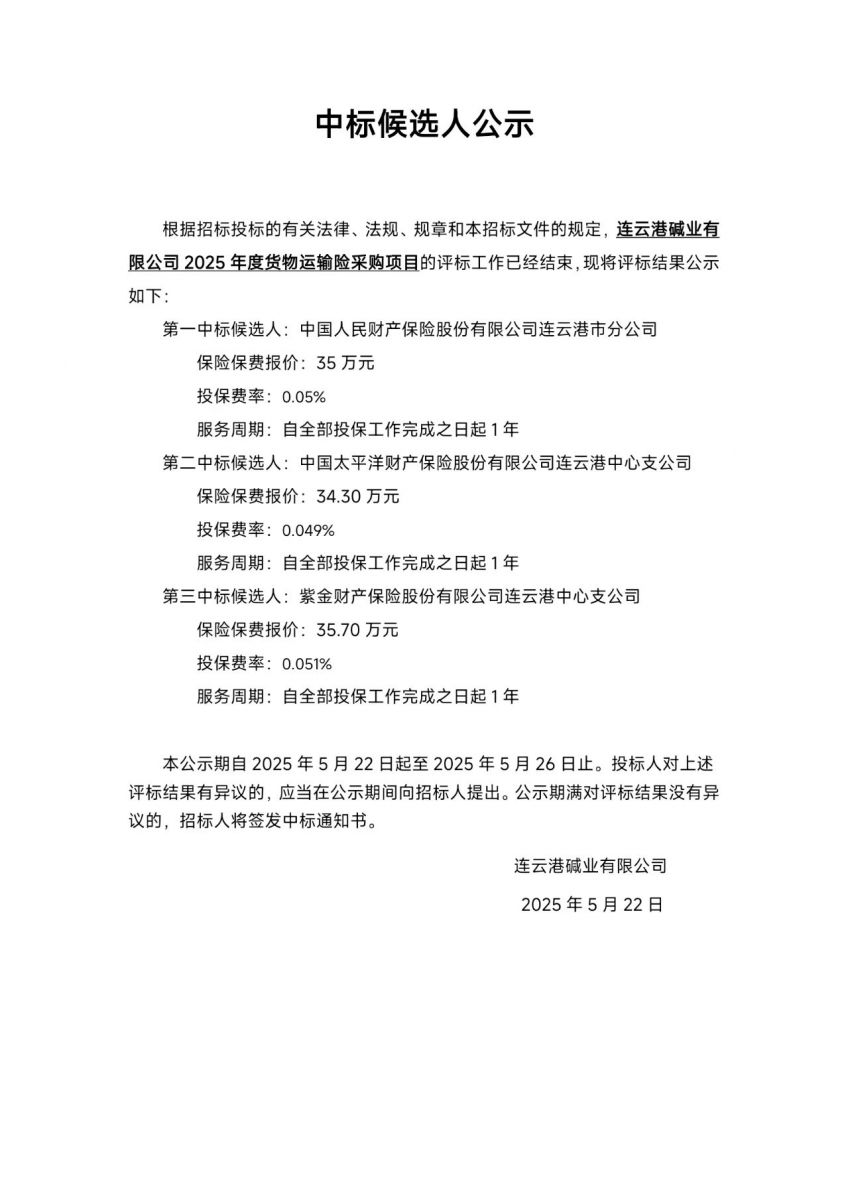 連云港堿業(yè)有限公司2025年度貨物運(yùn)輸險(xiǎn)采購(gòu)項(xiàng)目中標(biāo)候選人公示