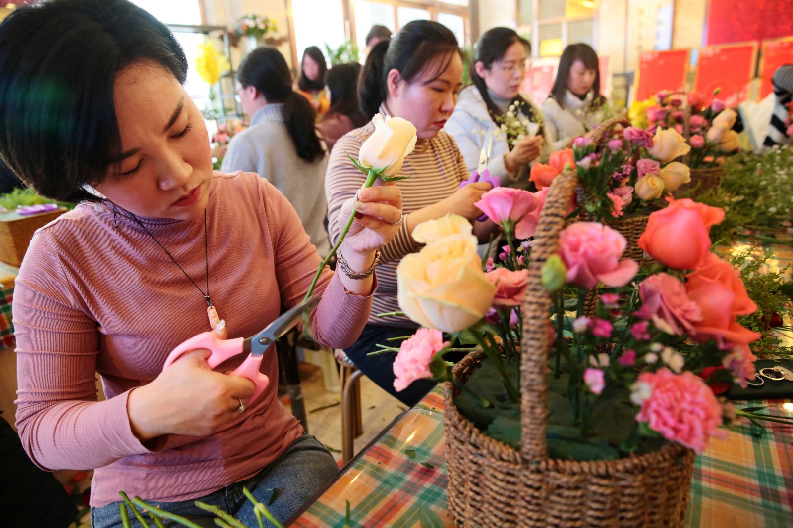 插花培訓(xùn)期間,花藝師講授花藝知識與插花技巧,并現(xiàn)場制作演示。通過老師的傳授,大家初步認(rèn)識了一些基本花材和插花器具,了解了插花制作的基本技巧和插花藝術(shù)的美學(xué)鑒賞等花藝基礎(chǔ)知識。隨后,大家現(xiàn)學(xué)現(xiàn)用,根據(jù)自己對美的不同理解,把原本普通的花草,經(jīng)過修剪、彎曲、成組搭配、點(diǎn)綴等步驟,變成了色彩斑斕、獨(dú)具匠心的花藝作品。