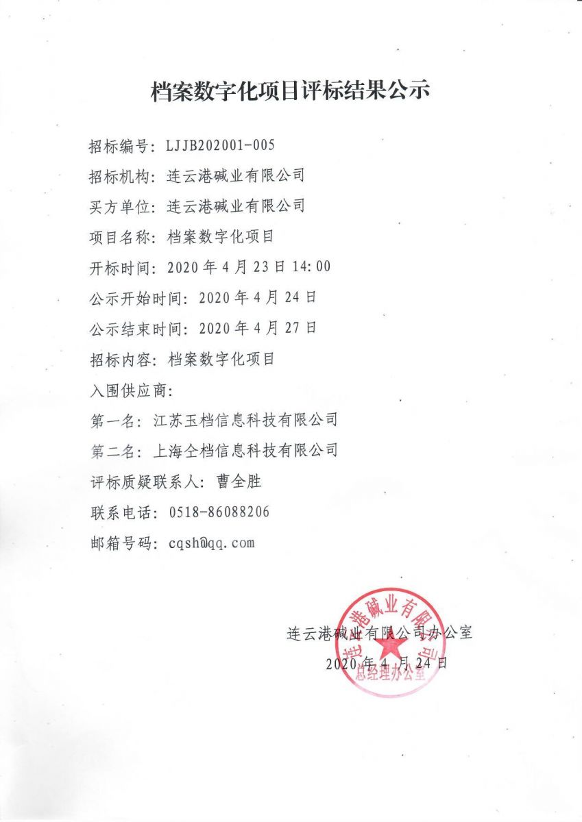 連云港堿業(yè)有限公司檔案數(shù)字化項(xiàng)目評(píng)標(biāo)結(jié)果公示