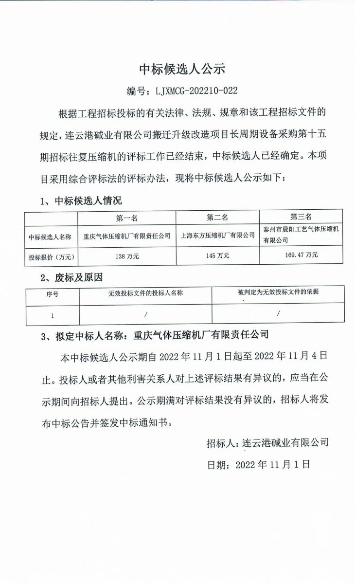 往復(fù)壓縮機(jī)采購(gòu)招標(biāo)中標(biāo)候選人公示